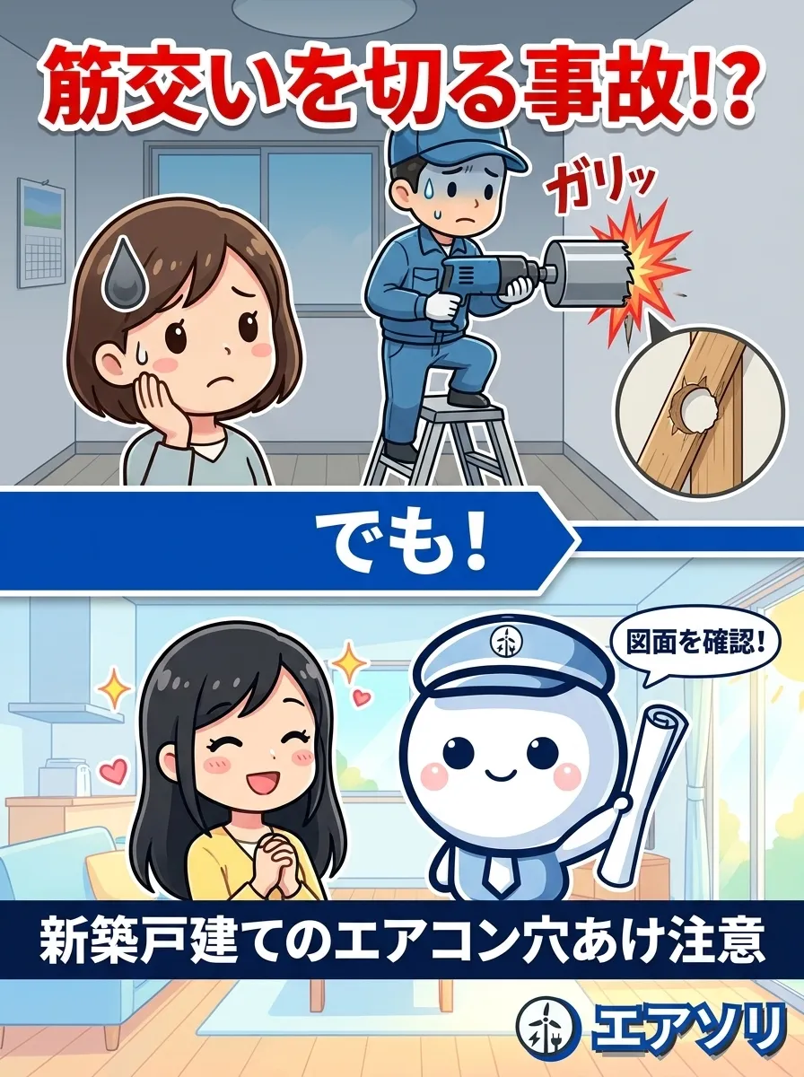 はい、新築〜築浅戸建てのエアコン増設で筋交いや柱を傷つけた事例は、福岡でも珍しくありません。特に当日工事・下請け丸投げの業者で起きやすいです。「図面を見せて」と言える業者を選ぶのが防衛策です。