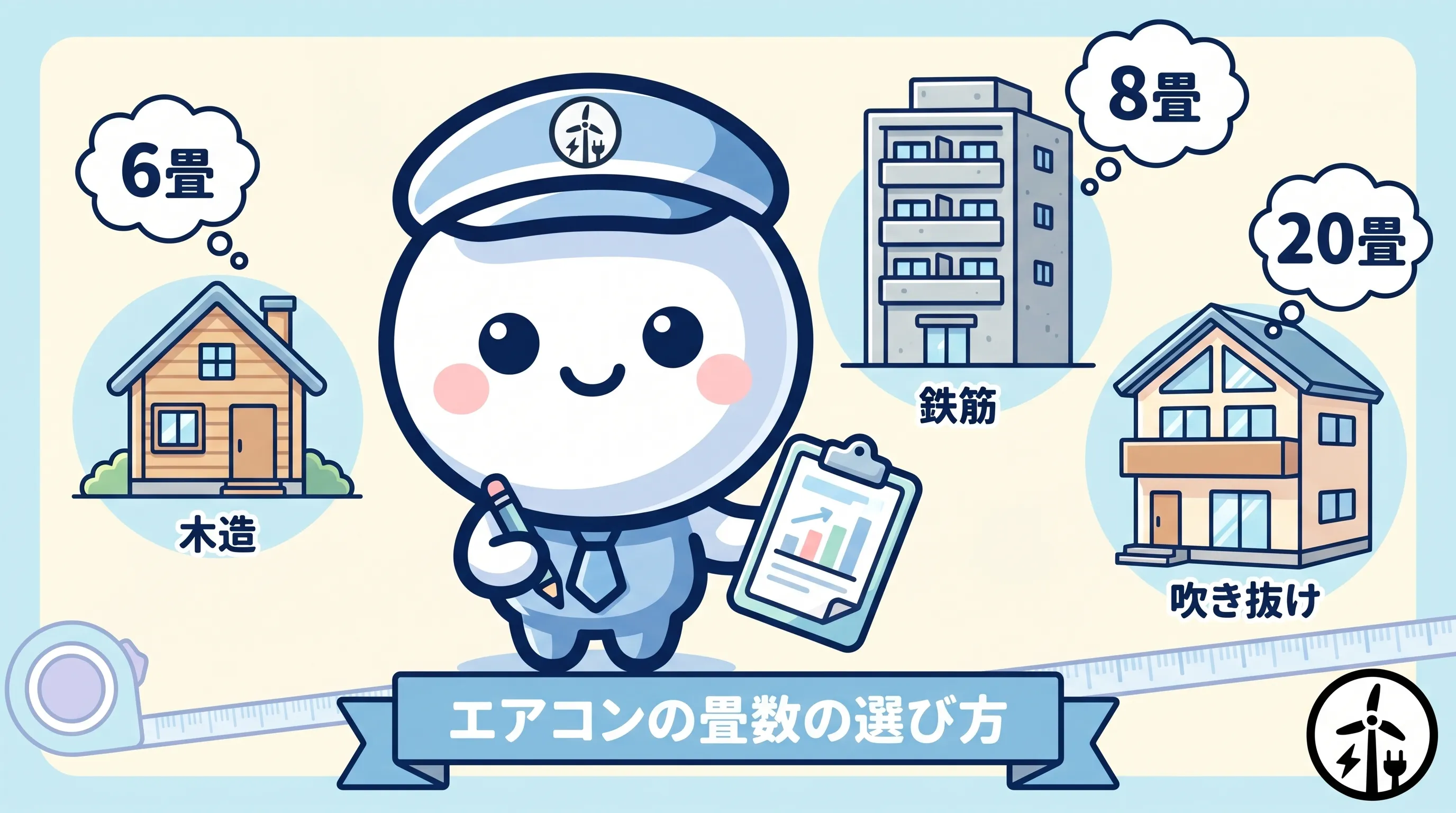断熱性能と気密性が違うためです。木造は熱が逃げやすく外気温の影響を受けやすいので、畳数表記の上限値(例:6〜9畳の上限9畳)に近い表記を選びます。鉄筋マンションは断熱性が高く室温が安定しているため、表記の1.5倍程度まで余裕で対応できます。